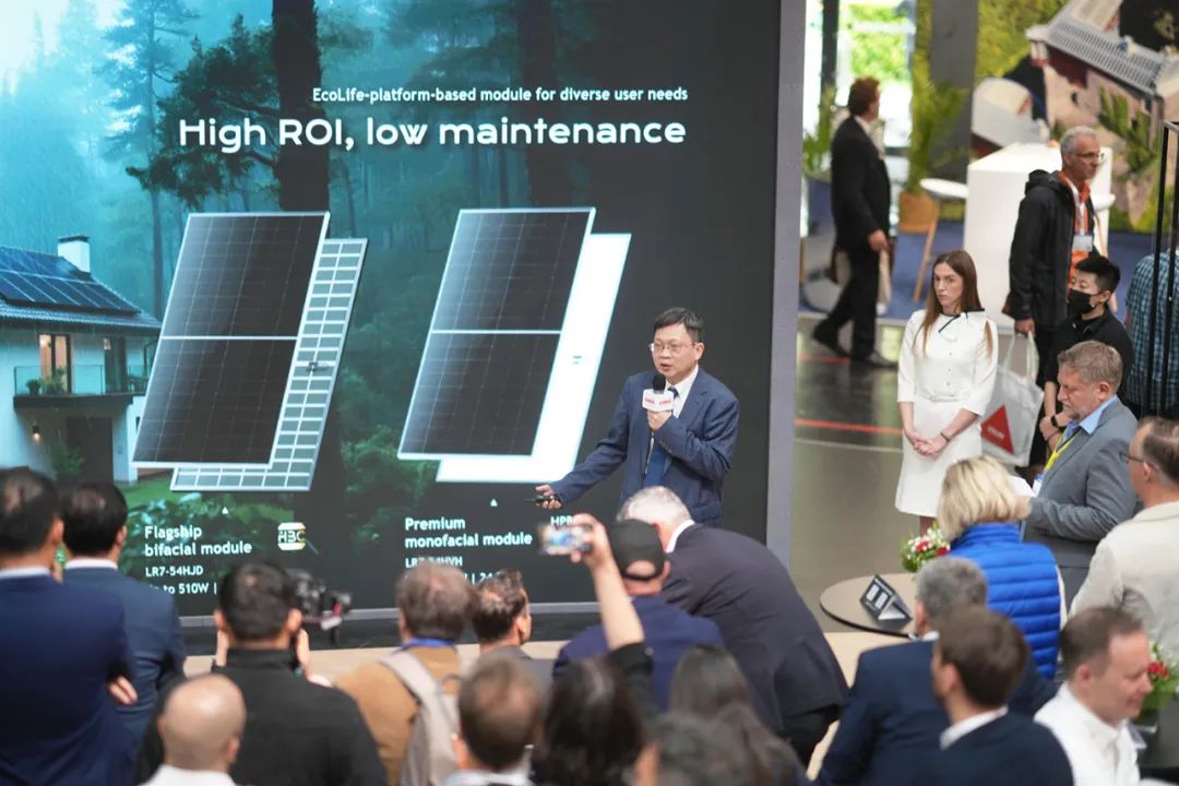 本次Intersolar首发的组件版型为54双面优选版型,专为住宅应用场景设计,最大功率输出高达510W,每平方米功率比达到250W/m²。与当前TOPCon组件相比,同等面积之下,EcoLife系列输出功率高出40W,由此带来屋顶安装容量提升高达9%。