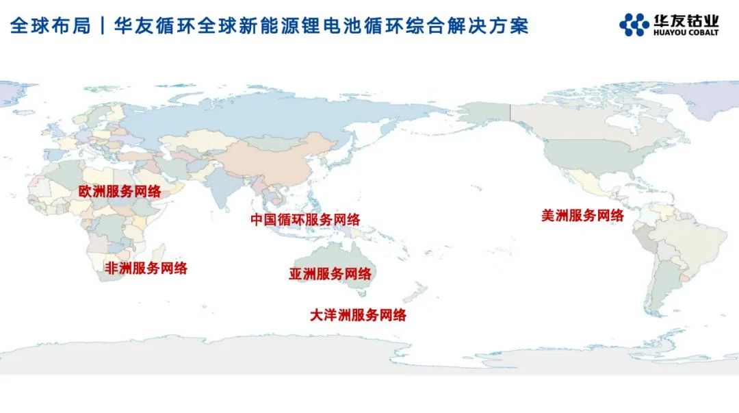 具体而言,华友循环基于在中国东北(吉林长春)、华北(北京)、华东(江苏南京、浙江衢州)、西南(四川成都、广西玉林)、华中(湖北筹建)、华南(惠州筹建)等,覆盖全国范围的完善的锂电回收处理产能和锂电回收平台公司网络体系,已构建了覆盖锂电回收全流程的完善服务体系。