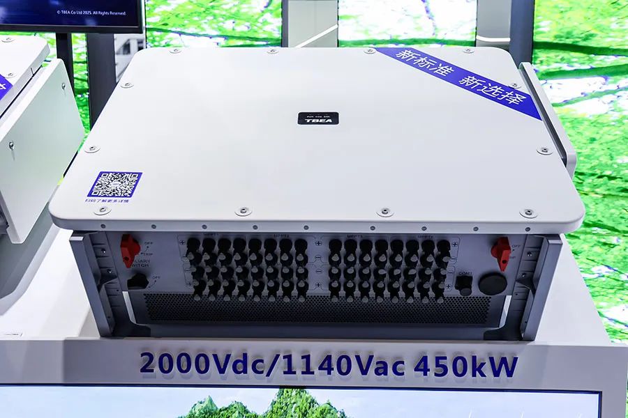 面向更高效率和更高可靠性需求,最新推出的2000V 450kW组串式逆变器,2000Vdc/1140Vac设计降低BOS成本,转换效率提升0.2%,体积功率密度较前代提升37%。