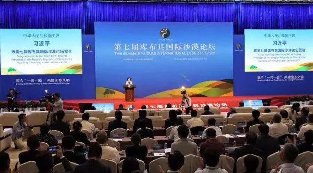 库布其国际沙漠论坛是全球唯一的致力于推动世界荒漠化防治和绿色经济发展的大型国际论坛。2014年2月,中国批准库布其国际沙漠论坛为国家机制性大型涉外论坛。作为推动实现联合国防治荒漠化零增长目标的民间机制,论坛将是联合国防治荒漠化公约缔约方大会的重要补充平台。第七届论坛围绕“绿色‘一带一路’,共建生态文明”主题,交流探讨“一带一路”沿线国家荒漠化防治与合作、消除贫困、沙漠生态科技创新、率金融创新与发展、促进生物多样性保护等当前国际社会高度关注的问题。