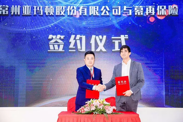 幕尼黑再保险公司Dr. Ronald 和亚玛顿销售总监沈总登台,共同签署组件保险合同。在今年5月,亚玛顿凭借自身过硬的软、硬件实力顺利通过了德国慕尼黑再保险高标准的验厂。德国慕尼黑再保险是全球最具权威的再保险公司,将为亚玛顿30年的功率质保保驾护航。