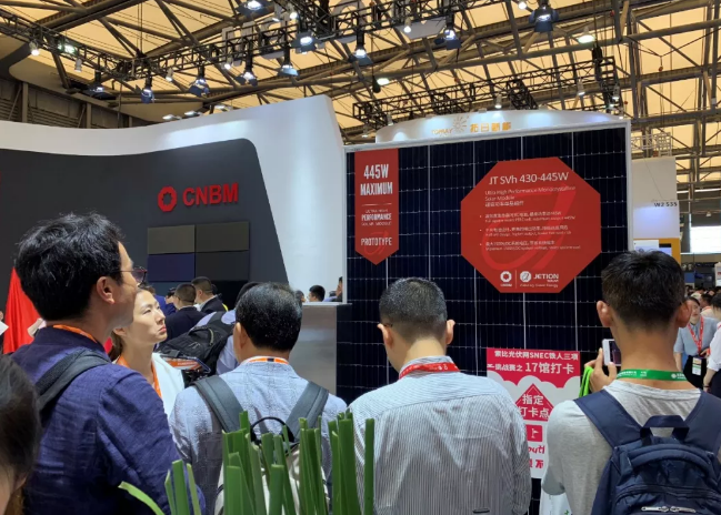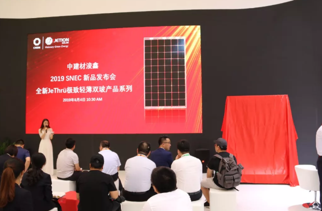 2019年6月4日,全球规模最大、影响最深的太阳能光伏盛会SNEC在上海浦东新国际博览中心隆重举行。中建材浚鑫在W2-550展台国内首发全球最轻薄双玻产品“JeThrü”以及445W超高功率组件,现场受到热烈反响。