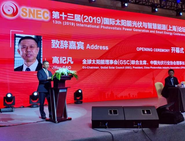 6月3日,SNEC第十三届(2019)国际太阳能光伏与智慧能源(上海)展览会暨论坛在上海开幕,中国光伏行业协会理事长、天合光能股份有限公司董事长兼首席执行官高纪凡应邀出席开幕式并致辞。