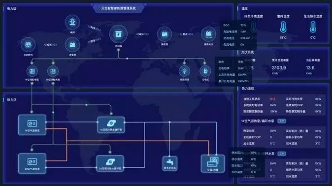天合光伏智慧家能源管理平台是行业首个“光伏+空气能”智慧能源管理平台。平台嵌入“光伏+”系统,包含空气能冷暖热三联供、储能、充电桩和照明系统等。在实际运行过程中,能源管理平台不仅能主动、快速为客户提供定制化精准技术服务支持,还能优化产品在整个使用寿命周期内的运行成本。白天利用光伏发电给空气源热泵、热泵热水器、充电桩供电,并将多余电量储存在储能电池中;夜晚储能电池将释放电量给空气源热泵和照明用,无需电网电力补充供应。