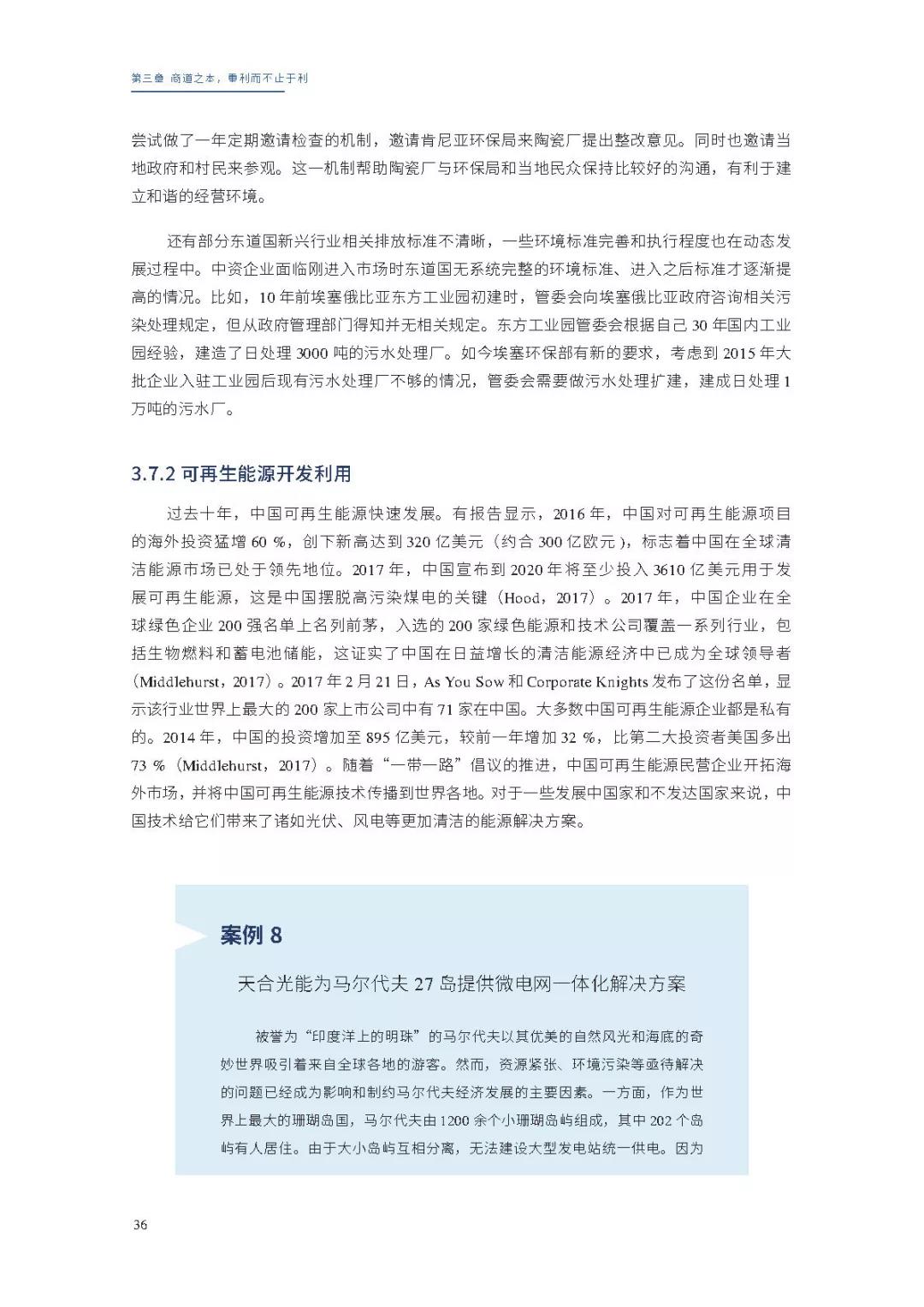 在马尔代夫,天合光能依据不同用电需求和既有用电结构,为当地的岛屿群定制了光伏+储能+柴发的微电网群解决方案,项目含4.6兆瓦光伏组件、4.97兆瓦时储能系统和6兆瓦柴油发电机,是全球最大的岛屿微电网群项目之一。这个解决方案减少了柴油发电的不稳定性对当地居民用电的影响,解决了当地一万一千多居民的用电需求,每年节省柴油5000多升,相当于减排二氧化碳12.5吨。联合国开发计划署编写的《中国民营企业“一带一路”可持续发展报告》在大会当天发布,天合光能马尔代夫微电网项目作为可再生能源开发利用的代表案例,为“一带一路”沿线国家和地区的能源发展提供了借鉴和思路。
