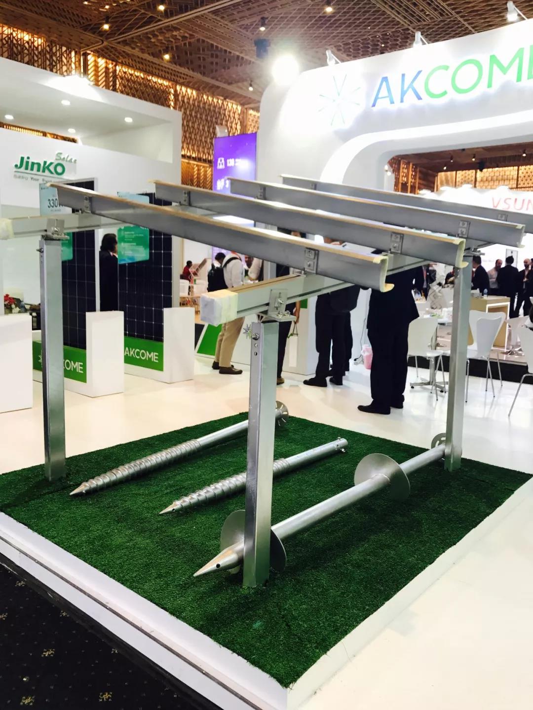 另一款展示的是平单轴追踪系统支架,目前已被列入First Solar合格支架供应商名录。独特压块设计,可实现快速安装;多点檩条支撑,使系统安全可靠,保证25年质保,可广泛应用于平地、山地、渔光、牧光、平屋顶等项目。