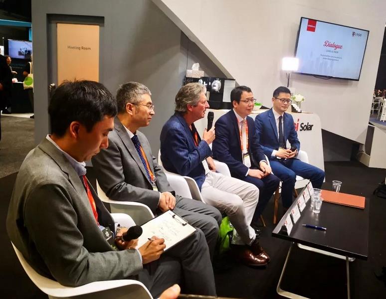 演讲结束后,马丁•格林教授来到隆基展台,与隆基乐叶总裁李文学先生共同出席了由隆基与UNSW联合举办的“LONGi and UNSW”对话沙龙。来自UNSW的欧阳子博士主持了本次对话,并邀请与会嘉宾就“光伏技术发展趋势”分享了看法。