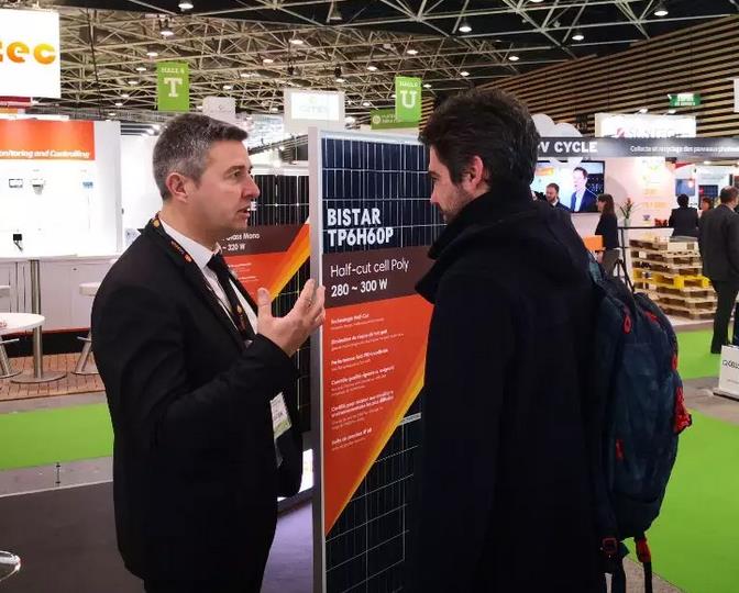 腾晖光伏重点展示了双玻高效单晶和半片多晶组件两款产品,其中BISTAR TP6H60P为60片电池组件,采用半片多晶电池技术,最高功率达300W。TWINKLE TP660M为60片电池组件,采用双玻PERC高效电池技术,最高功率达320W。此外,法国市场有大量的光伏项目对产品“碳足迹”有很高的要求,腾晖光伏作为为数不多几家符合“碳足迹”标准的组件厂家,吸引了法国当地众多项目商的目光。