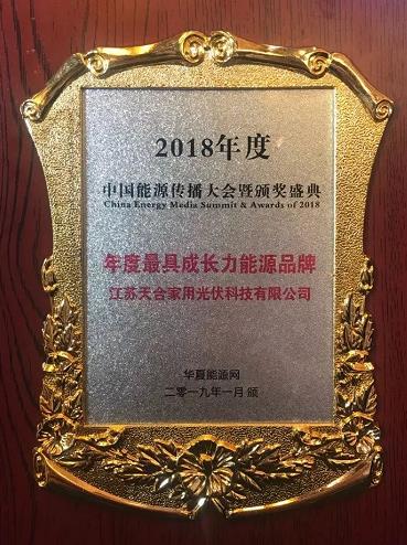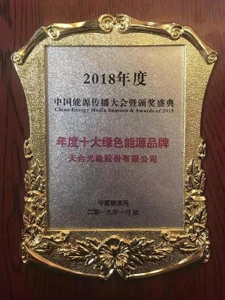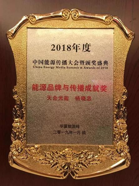 大会为天合光能颁发了“年度十大绿色能源品牌”,为天合光能旗下的家用光伏品牌“天合富家”颁发“年度最具成长力能源品牌”,并为天合光能首席品牌官杨晓忠颁发“能源品牌与传播成就奖”。