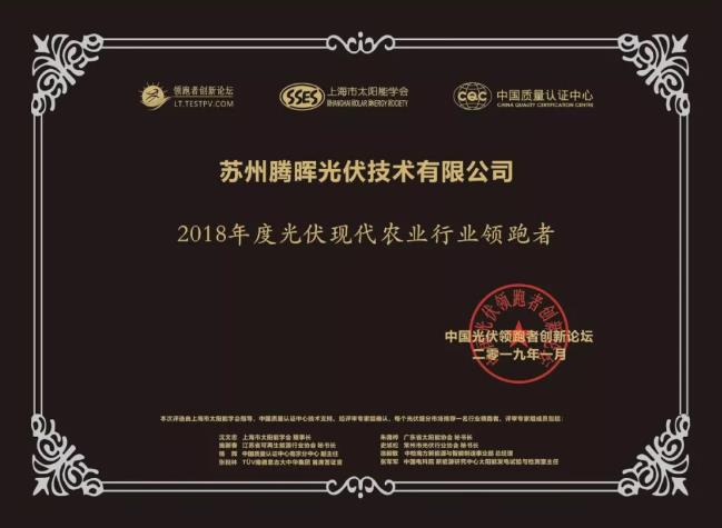 智能光伏+科技农业!腾晖光伏荣获“2018年度光伏现代农业行业领跑者”