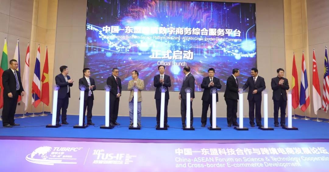 在中国—东盟科技合作与跨境电商发展论坛上,启迪控股常务副总裁、清华科技园管委会副主任、国际科技园及创新区域协会(IASP)副主席陈鸿波,缅甸联邦共和国驻华大使馆公使Mr.Han Win Aung,广西科技厅国际合作处副处长罗锦模,中国-东盟科技产业合作委员会东盟方主席、文莱国家工商会会长卡玛鲁汀,启迪控股高级副总裁、广西启迪董事长李东明,老挝人民民主共和国驻华大使馆一等秘书翁泰•赛雅翁,越南社会主义共和国驻华大使馆一等秘书张越雄,中国国际电子商务中心研究院副院长张建军,南宁市邕宁区人民政府常务副区长黄福来,深圳市莱斯购电子商务有限公司董事长丁国勋共同见证了“中国—东盟跨境数字商务综合服务平台”启动。