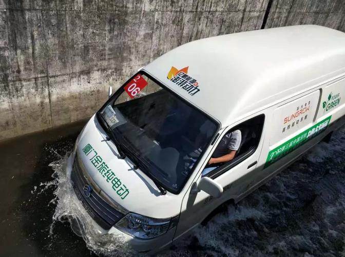 作为连续参加三届挑战赛的“老司机”,厦门金旅选派全新车型出征显然是有备而来,龙运3.0搭载了阳光电源驱动系统,该系统峰值功率87kW,使整车最高车速超过100km/h,在挑战赛中充分展示了其澎湃动力。同时,驱动系统防护等级高达IP67,在水下亦可安全平稳的输出动力,协助龙运3.0轻松完成40cm水深的涉水挑战。