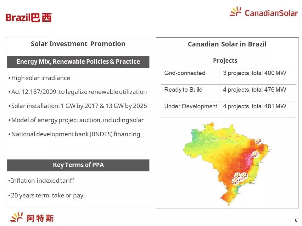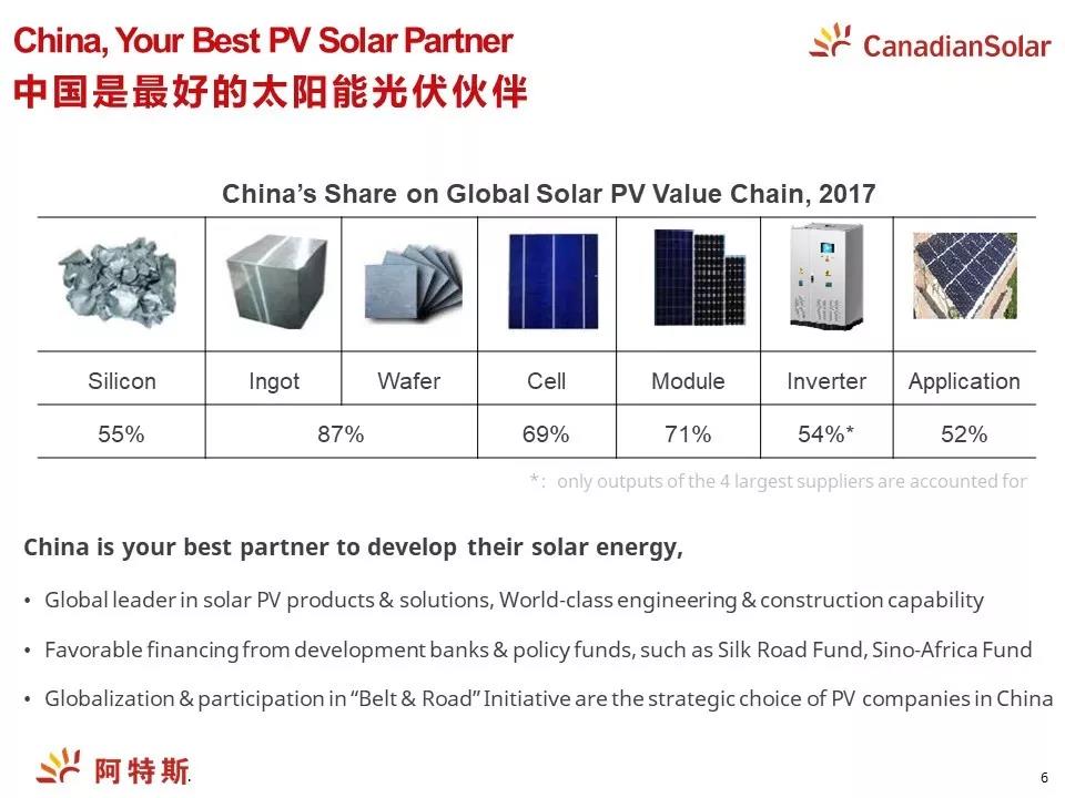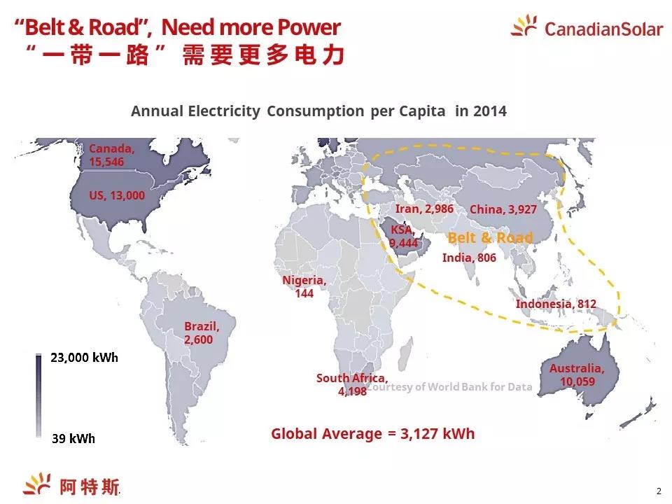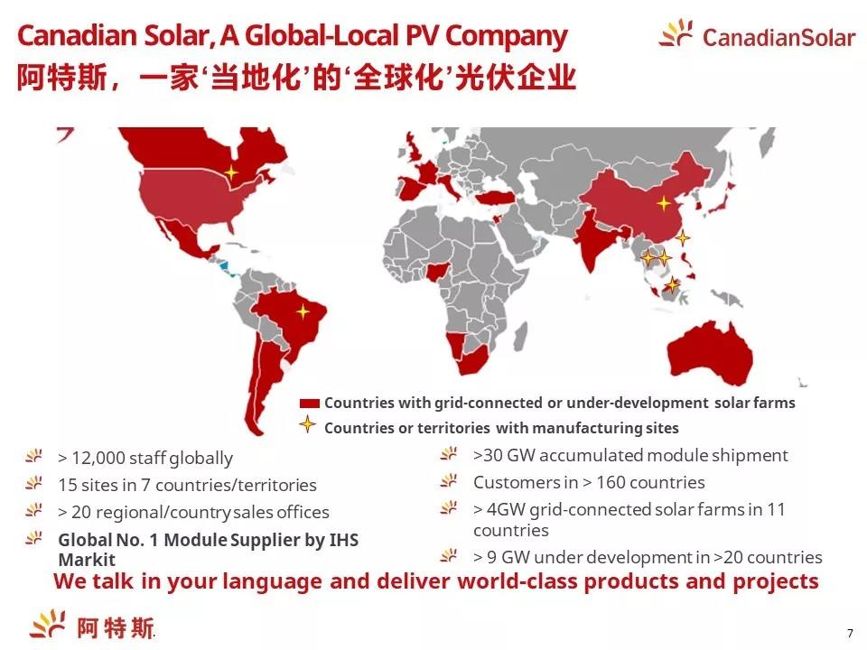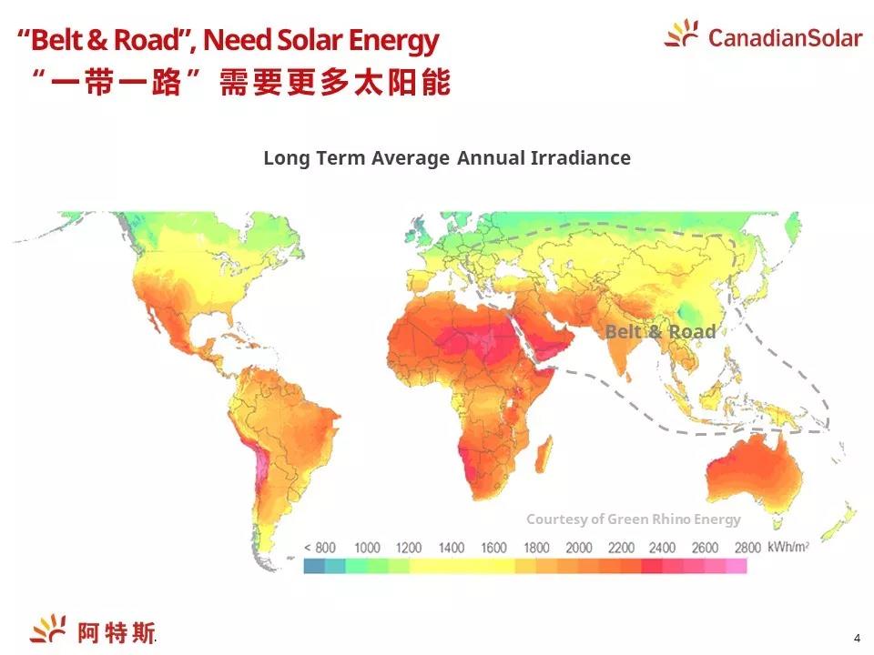 作为光伏发电企业中投资布局“一带一路”沿线国家和地区的中坚力量,阿特斯继续在“一带一路”国家不断耕耘,成果显著。至今,我们在“一带一路”沿线的泰国、越南、巴西、印尼共有4个生产制造基地,雇佣当地员工和管理人员超过2300人。为沿线60多个国家和地区的客户,提供光伏组件和发电系统产品,销售额累计超过26亿美元(约合人民币180亿元),光伏制造和太阳能发电项目投资超13亿美元(约合人民币89亿元)。在境外投资和经营过程中,阿特斯发挥国际化经营和专业能力优势,致力于当地的经济和社会发展,并取得良好成效,与各国人民共享新能源发展成果!
