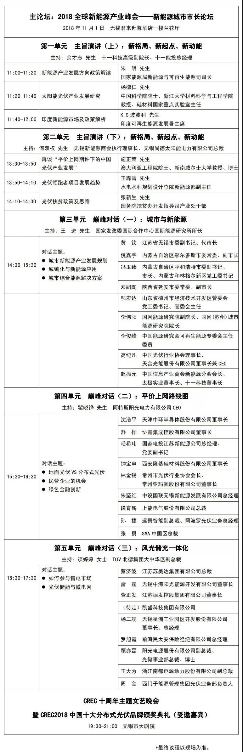 11月1日,中国(无锡)国际新能源大会暨展览会将迎来十周年,组委会将继续发扬论坛“高规格、高层次、高人气”的特点,举办1个主论坛、8场专业分论坛。拟邀中国能源研究会理事长吴新雄、国家能源局副局长綦成元(待定)、国家能源局新能源和可再生能源司司长朱明(待定)、江苏省能源局局长杭海、中国科学院院士杨德仁等政府领导和专家院士出席;同时,全球太阳能理事会主席、亚洲光伏产业协会主席、中国电力企业联合会副理事长、协鑫(集团)控股有限公司董事局主席朱共山,中国光伏行业协会理事长、天合光能股份有限公司董事长兼CEO高纪凡,中国企业联合会副会长、远东集团董事局主席蒋锡培,中国信息产业商会新能源分会会长、太极实业董事长、十一科技董事长赵振元,天津中环半导体股份有限公司董事长沈浩平等民营企业领袖也将莅临展会。此外,国务院扶贫办、水规院、国电投、国家能源集团、中国电建、SMA、西门子等主管机构、央企和外企代表也将参加本次大会。据统计,本届展会的演讲嘉宾将超过200人。