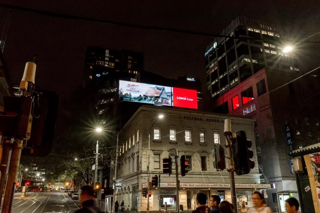 展会期间,隆基乐叶“可靠创造价值”的广告闪耀在墨尔本的交通要道,用光伏点亮这座海滨城市的夜空。