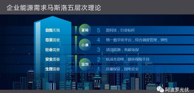 马斯洛需求层次理论将人类需求像阶梯一样从低到高按层次分为五种,分别是:生理需求、安全需求、社交需求、尊重需求和自我实现需求。远景认为,随着能源革命的展开以及工业4.0对企业降本增效提出的要求,在企业尤其是高耗能企业,也存在着用能需求的“马斯洛理论”。换句话说,越来越多的企业开始追求能源结构转型。