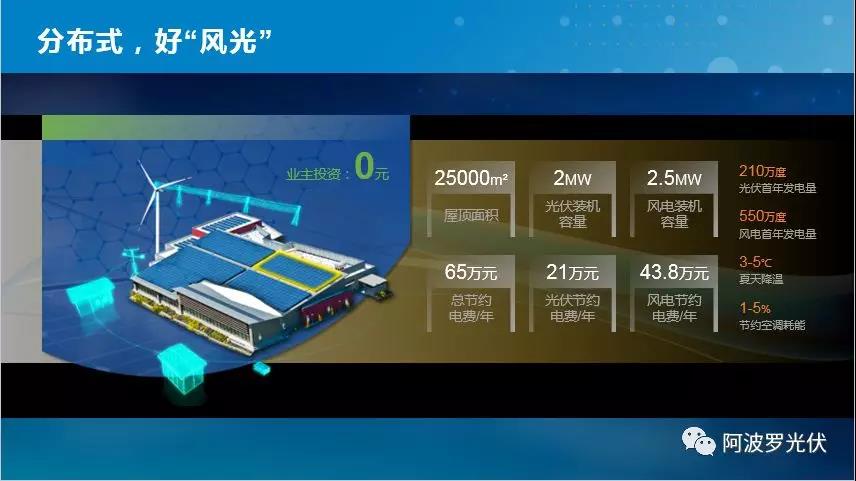 分布式光伏:容量约2MW,占用闲置屋顶面积25000㎡,首年发电超210万度,为业主实现电费优惠超20万元;