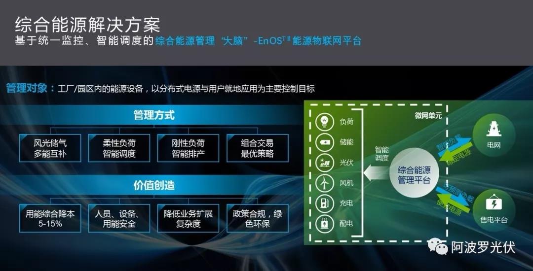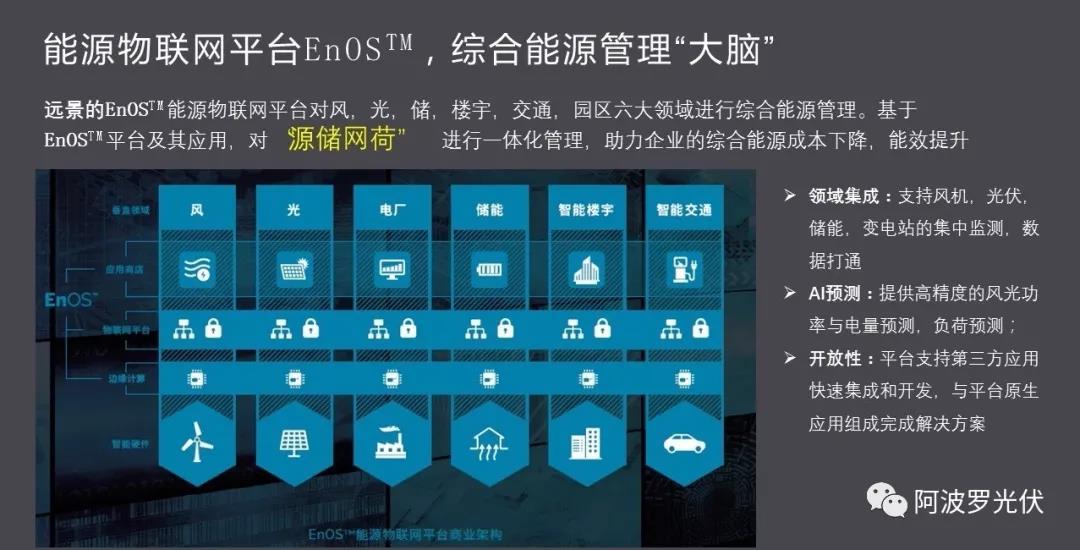 “风、光、储、配、用、售是‘神剑’,智能物联网平台EnOS™是‘大脑’,‘六脉神剑’+‘一个大脑’将为企业在最大程度上降低用能综合成本”。