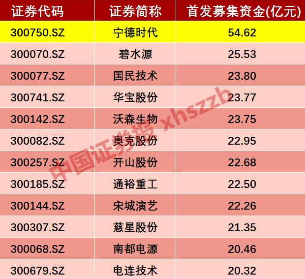 中证君统计发现,宁德时代募资54.62亿元的IPO规模是自2009年创业板正式设立以来最大的一桩IPO。虽然相比之前预期募资131亿元有所“缩水”,但54.62亿元的IPO规模依然稳坐创业板第一IPO宝座。此前,创业板最大一笔IPO是2010年上市的碧水源,其募资规模为25.53亿元。