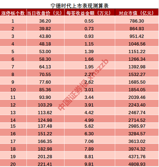 从宁德时代上市股价模拟测算表看,如果收获10个涨停板,其每签收益最高可达3万元;若与药明康德一样收获16个涨停板,每签收益最高可达6.30万元。