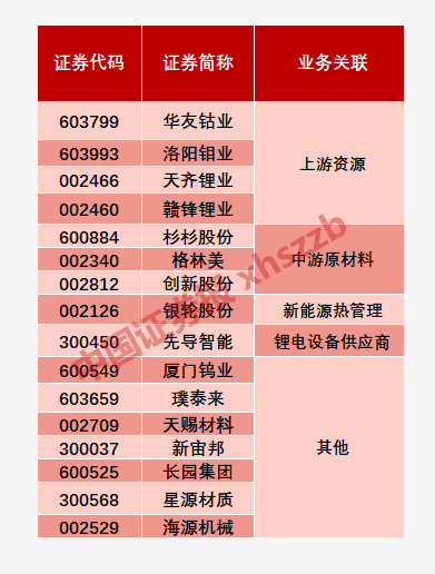 其中,上游资源有:华友钴业、洛阳钼业、天齐锂业、赣锋锂业;中游原材料有杉杉股份、格林美、创新股份等;新能源热管理有:银轮股份;锂电设备供应商为先导智能。
