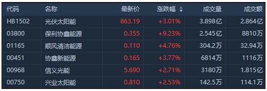 近日A股热炒HIT光伏电池概念,港股光伏股跟随走强。截至昨日发稿,保利协鑫能源(03800)涨9.23%,报0.355港元;协鑫新能源(00451)涨3.77%,报0.165港元;信义光能(00968)涨2.71%,报5.69港元;兴业太阳能(00750)涨2.53%,报0.81港元。