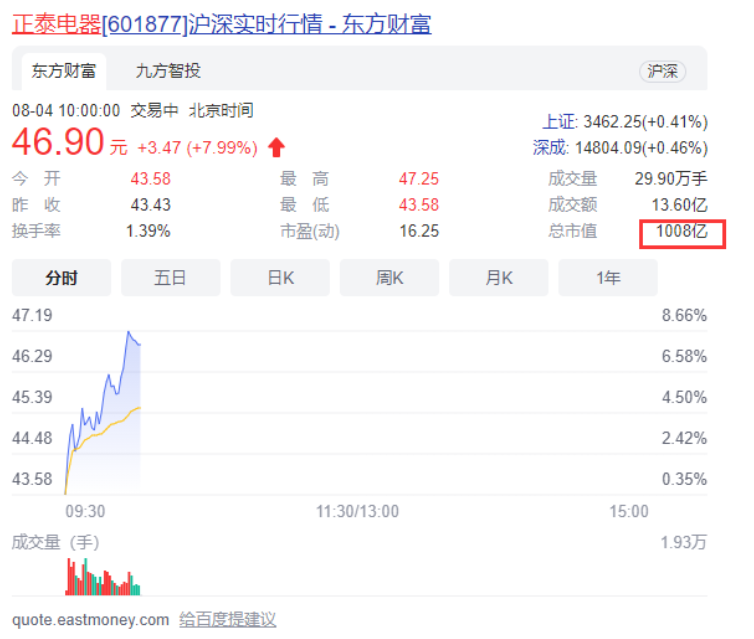 8月4日,正泰电器盘中总市值破千亿元,成为第13家千亿市值的光伏企业。
