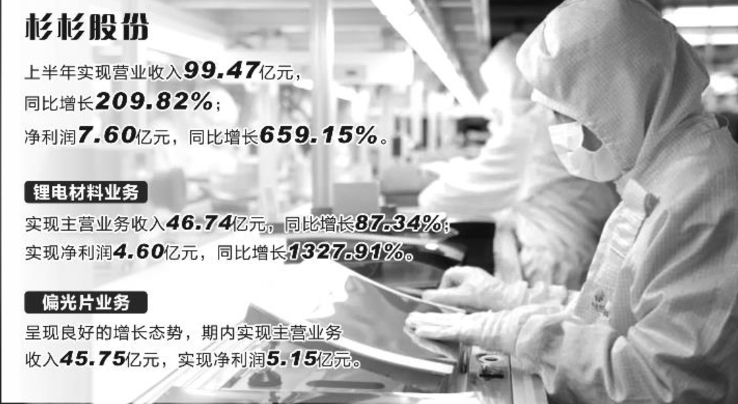 证券时报·e公司记者注意到,杉杉股份业绩大幅上涨主要得益于锂电材料和偏光片两大核心业务共同发力。