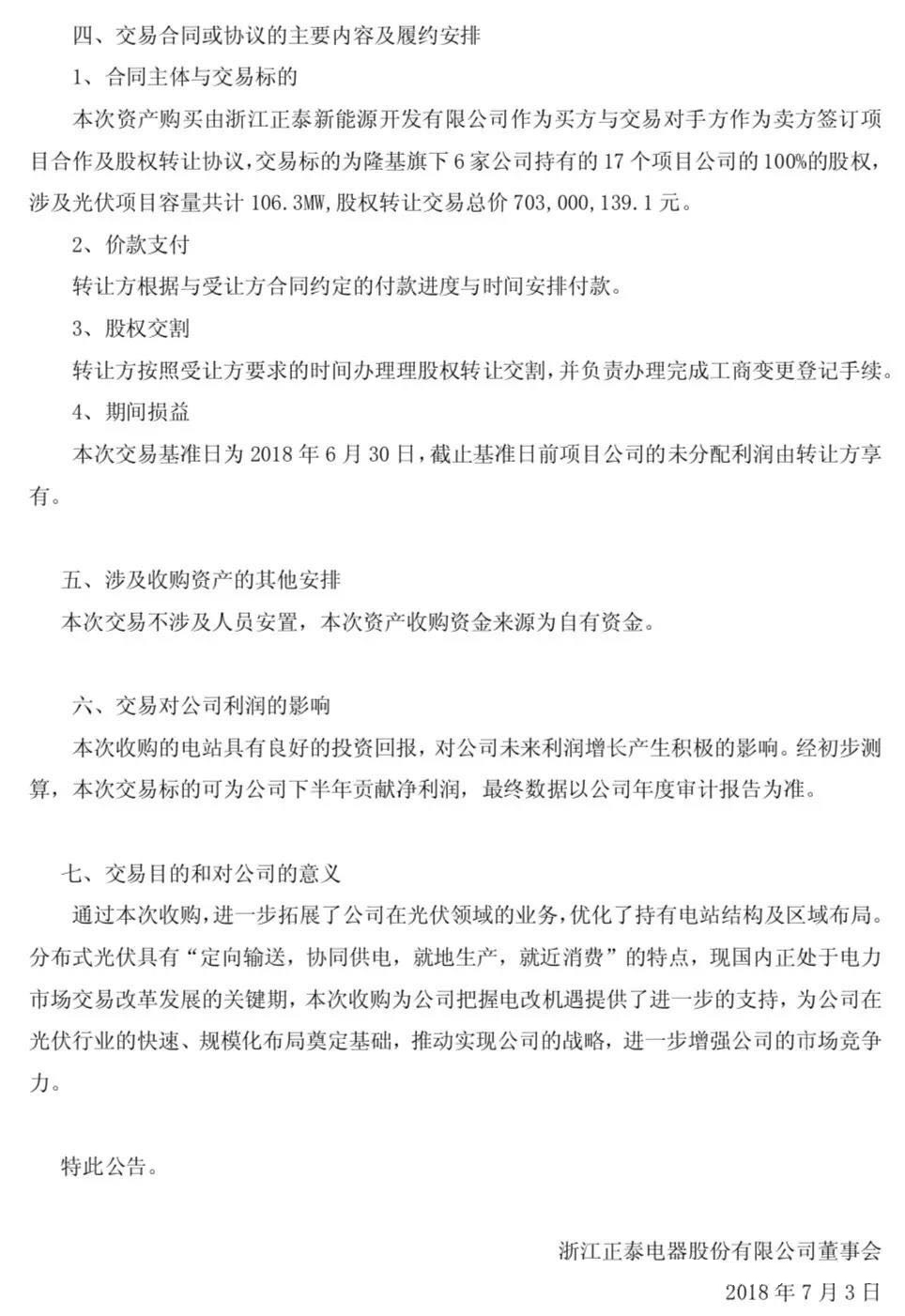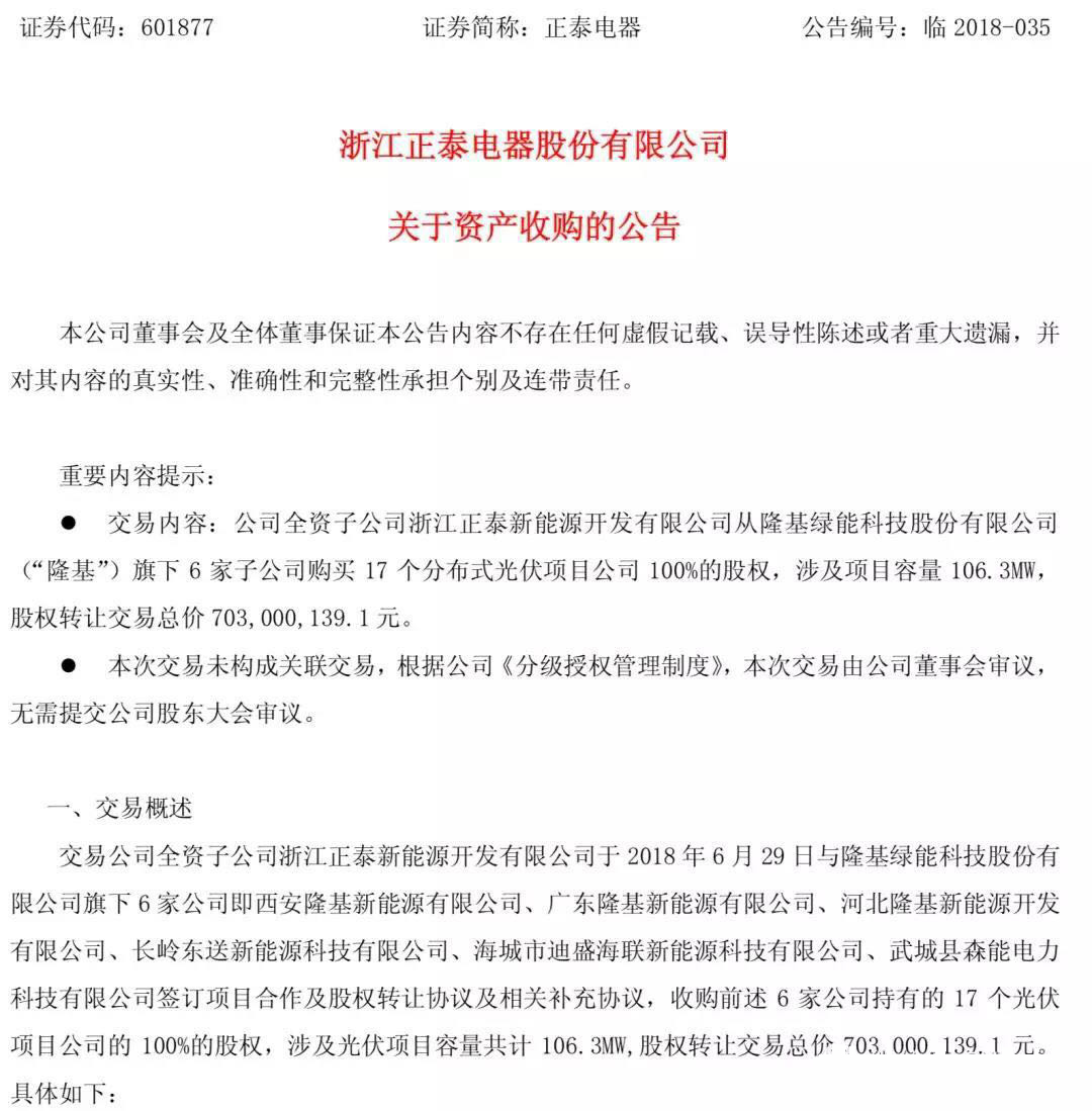 2018年7月2日,浙江正泰电器股份有限公司发布《关于资产收购的公告》,公告称,其全资子公司浙江正泰新能源开发有限公司(下称“正泰新能源”)从隆基股份(601012.SH)旗下子公司购买了17个分布式光伏项目公司100%股权,涉及容量106.3兆瓦,股权转让总价7.03亿元。