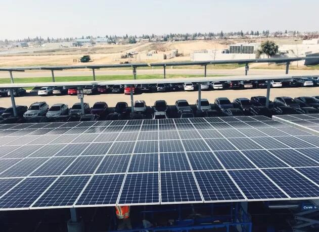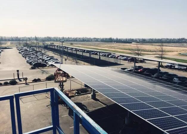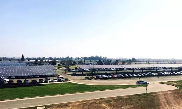 在美国加州克罗维斯市的中心社区学院,一排排光伏组件整齐的排列在停车场顶棚。