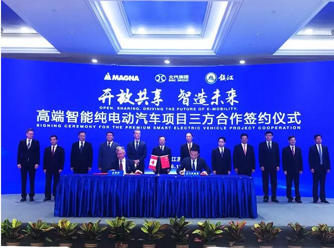 6月18日,北京新能源汽车股份有限公司(简称“北汽新能源”)与麦格纳在江苏南京签订合作协议条款清单,双方宣布拟成立合资公司,致力于打造对外开放共享的高端智能纯电动汽车研发与制造中心。江苏省和镇江市有关领导及麦格纳国际首席执行官唐·沃克(Mr. Don Walker),北汽集团党委书记、董事长徐和谊,北汽集团党委副书记、总经理张夕勇,北汽集团党委常委、北汽新能源党委书记、总经理郑刚等各方领导共同出席仪式。
