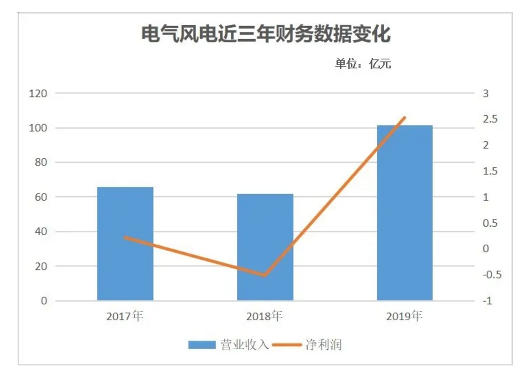 2017年、2018年和2019年,电气风电分别实现营业收入65.57亿元、61.71亿元、101.35亿元。
