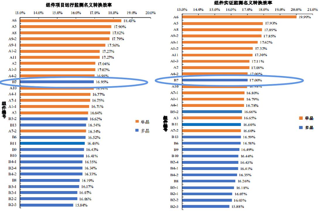 大同基地各组件型号转换效率指标对比如图所示,从集合对比的数据来看,日托光伏的MWT多晶组件(代号B7)项目运行和实证监测名义转换效率在所有多晶(蓝色)组件中排名遥遥领先,还高于超过三分之一的单晶组件产品,真正实现高效、长期运行。