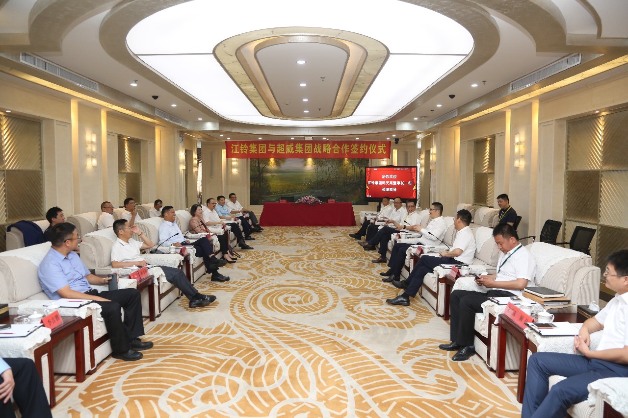 仪式期间,江铃汽车集团公司党委书记、董事长邱天高一行与集团董事长周明明就新能源汽车全产业链创新发展进行深入的探讨和交流,并实地参观了超威集团文化中心,详细了解了集团科技创新、新能源产品研发制造、高端人才引进、和合文化以及新能源汽车服务平台等方面情况。