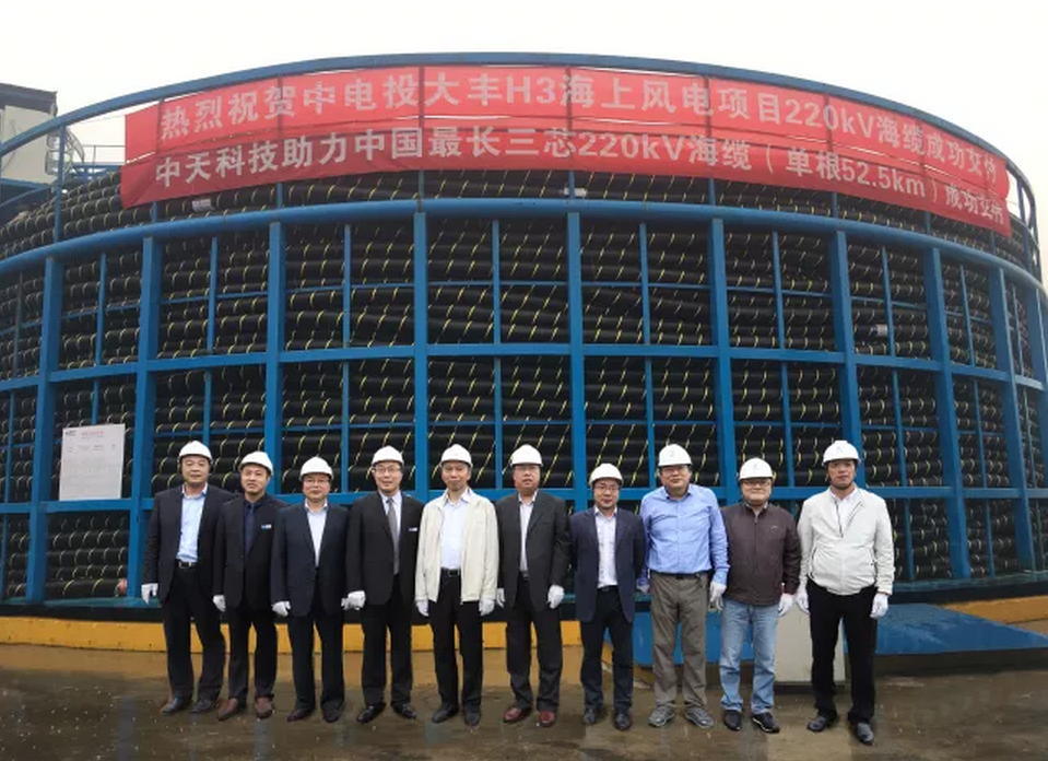 中电投大丰H3海上风电示范项目位于大丰市亮月沙北侧的海域,风电场规划范围约90平方公里,规划总装机容量300MW,风电场安装72台单机容量为4.2MW的风力发电机组,中天科技为该项目提供了全部的三芯220kV和35kV光纤复合海底电缆,打破了我国三芯220kV交流海缆单根出厂交付长度和重量的纪录,避免了海缆线路中因引入抢修接头而增加的运行风险,缩短施工周期和降低敷设成本,具有重要的经济和示范意义。