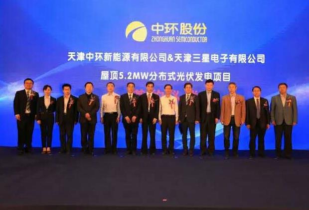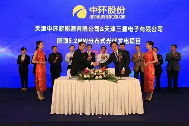 2018年4月23日,天津中环半导体股份有限公司旗下光伏电站开发企业——天津中环新能源有限公司与天津三星电子有限公司举行签约仪式,宣布在三星电子5万平米的工厂屋顶上,建设5.2MW屋顶分布式光伏电站,项目每年产生的524万度电能,将用于三星电子日常生产和办公所用。天津市发改委能源处处长高怀英,天津市经济技术开发区西区管委会办公室主任张子龙,中环集团总经理、中环股份董事长沈浩平,中环股份总经理秦玉茂,天津三星电子有限公司总经理金佑中等领导出席此次仪式。