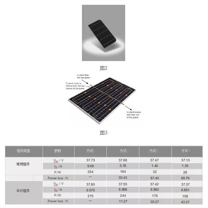 此外,与标准组件相比,新设计改善了电池片在遮挡或早晚条件下的电学性能。例如,如果标准组件以纵向方向安装而底部被遮荫,则会因为旁路二极管关闭整串电池片组,而导致整个组件输出功率为零。而半片组件得益于两部分电池片串组的布局,可确保在相同条件下,其输出功率至少仍能保持原先的50%( 图3表2)。