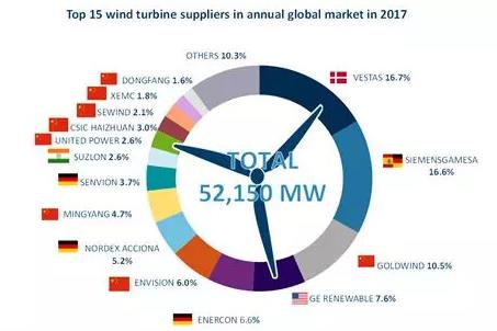 无独有偶,根据全球性商业咨询公司 FTI Consulting近日发布的数据,2017年全球共安装了21691台风电机组,由46家整机制造商提供。其中,金风科技全球市场份额达10.5%,稳居全球前三。