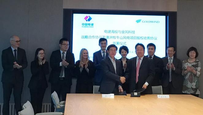 2018年04月11日,悉尼,新疆金风科技股份有限公司(“金风科技”;深圳交易所:002202;香港联交所:2208)与中国电建集团海外投资有限公司(“电建海投”)成功在悉尼签署战略合作协议及澳洲Cattle Hill风电项目股权转让协议。