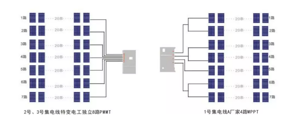 再次对比云南某光伏项目的1-2月发电量,我们发现最大不同就是各集电线应用了两家不同厂家的逆变器。据悉,1号集电线应用的A厂家的为4路MPPT组串逆变器,2号、3号集电线应用的是特变电工的8路独立MPPT组串逆变器(8路独立MPPT和4路MPPT示意图如下)。