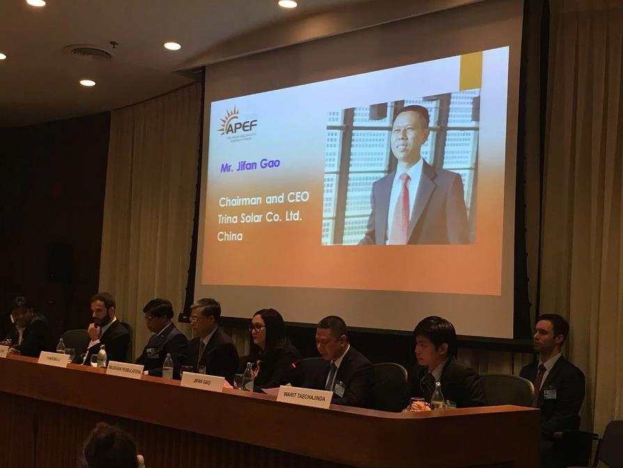 在联合国亚太经济社会委员会(ESCAP)第二届亚太能源会议上,高纪凡与中国国家能源局副局长李凡荣,哈萨克斯坦驻泰国大使及各国企业家代表等发言,为推进可持续发展目标提供天合智慧和案例。