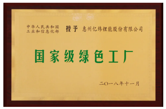 2019年1月,亿纬锂能荣获“国家级绿色工厂”称号。