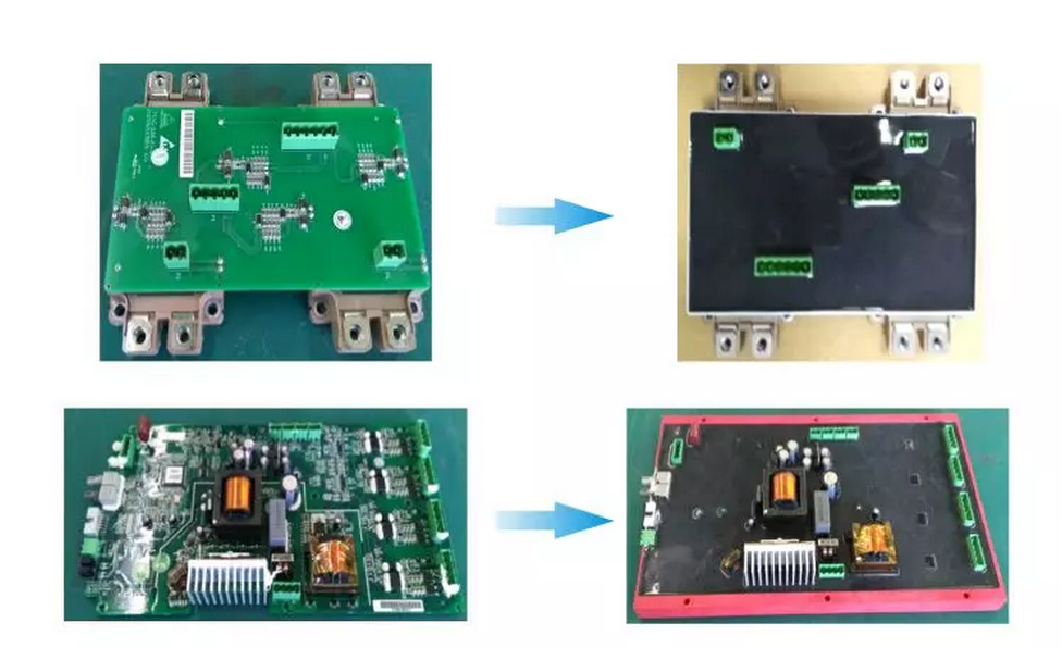 为保护印制电路板和IGBT功率器件不受恶劣工作环境影响,保证电子器件的电气性能和稳定性,做好防水防潮、防尘、绝缘、防腐蚀尤为重要,一般需要对印制电路板和IGBT功率器件的连接进行封装保护。
