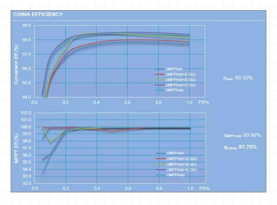 采用先进高效多电平拓扑,最高效率达到98.5%以上,MPPT最大追踪效率达到99.99%。同样条件下发电更多,收益更多。