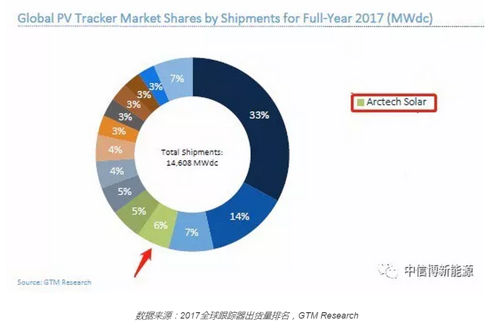 日前,据GTM Research最新发布的2017年全球光伏跟踪市场份额和出货量趋势报告显示。截止至2017年底,江苏中信博新能源科技股份有限公司(以下简称:中信博新能源)以累计13,510MW出货量的领先优势,位列“全球跟踪器和固定支架累积出货量”榜单第一。这也是中信博新能源继2016年在历史累积安装量全球问鼎之后,连续两年成为该国际榜单上的“状元”。