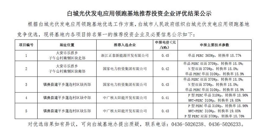 根据白城光伏发电应用领跑基地优选工作方案,白城市人民政府今日对白城光伏发电应用领跑基地中标结果进行公示,如下图: