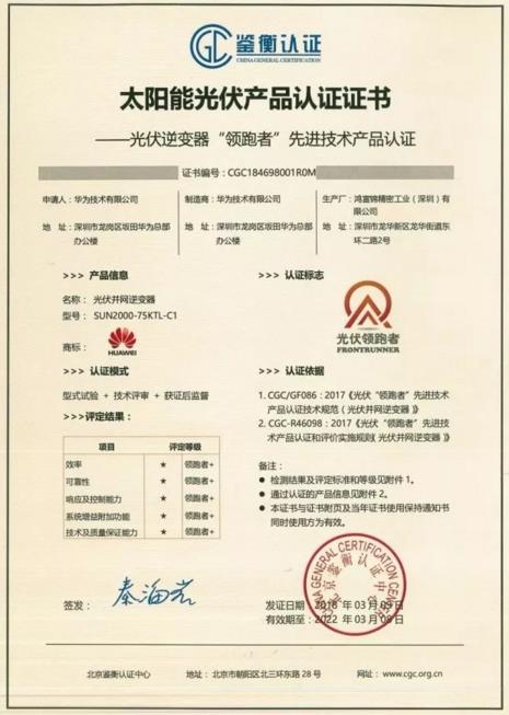 2018年3月9日,鉴衡认证中心向华为技术有限公司颁发了“5★”级光伏逆变器“领跑者”先进技术产品认证证书。