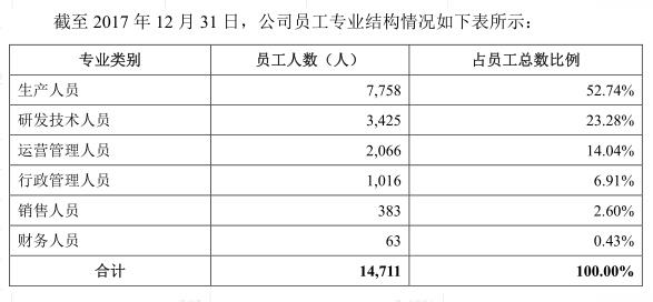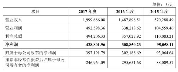 2015-2017年公司收入分别为57亿、149亿、200亿元,年均复合增长率高达 87.26%,净利润也从9.5亿元提高到42.9亿元,年均复合增长率高达 112.39%。值得一提的是2017年公司有接近18亿非经常性损益,主要是出售普莱德股权带来的收益,2017年扣非后的业绩为24.7亿元,相比于2016年略有下滑,主要是因为产品价格下滑,导致毛利率有所下滑,且公司持续加大研发投入所致。2015-2017年公司扣非净利率为15.4%、19.9%、12.4%。