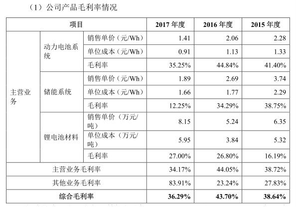 2015 年、2016 年及 2017 年,公司综合毛利率分别为 38.64%、43.70%和36.29%,毛利率略有下滑,但是显著好于价格下滑幅度,主要是的得益于成本的持续降低和生产效率提高,如电池单位制造电耗大幅降低等。