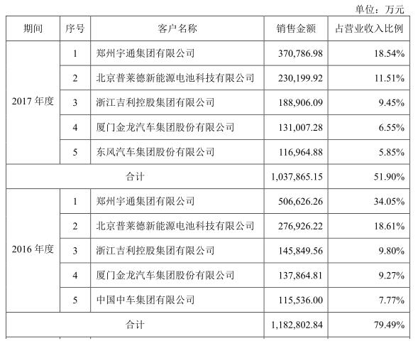 2016-2017年公司前五大客户没有太多的变化,基本都是宇通集团、普莱德(北汽新能源)、吉利汽车、金龙汽车和中国中车,仅金龙汽车和中国中车两家排名第五的公司略有变化,国内新能源客车龙头和乘用车龙头均为公司客户,值得一提是,前五家公司的依赖度和收入占比显著下降,如宇通收入占比从34.1%下降为18.5%,普莱德从18.6%下降为11.5%,前五的集中度从79.5%下降为51.9%,表明公司客户广度不断提升,侧面也反映国内越来越多整车公司加入新能源行业。